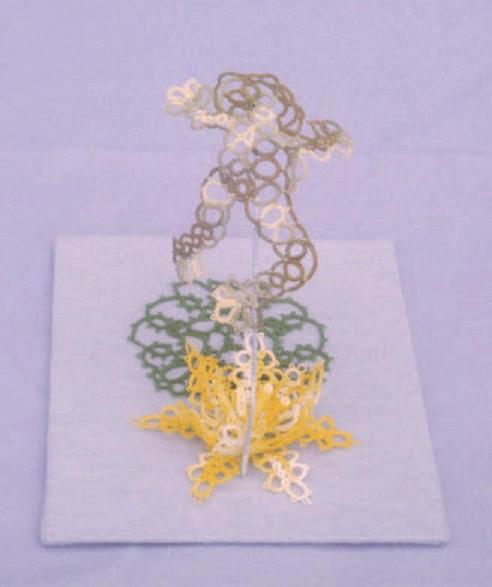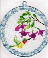 The hummingbird is my first original design. This suncatcher placed 1st in the tatting category at the 2001 Orange County (California) Fair, 2nd in the tatting category at the 2001 Los Angeles County Fair, and won a 1st Prize and Best of Class at the 2002 California State Fair. The fuchsias are from New Dimensions in Tatting by To de Haan vanBeek. The thread for the fuscias and hummingbird are Anchor size 80. The surrounding border is Finca Perle Cotton size 12. |