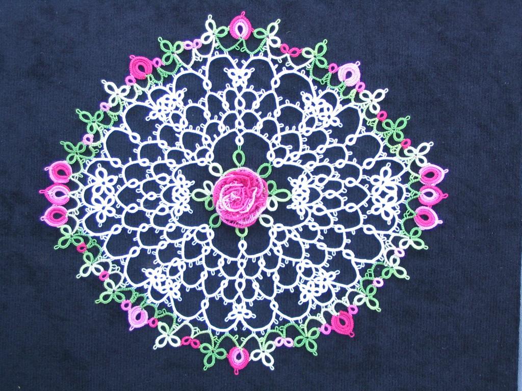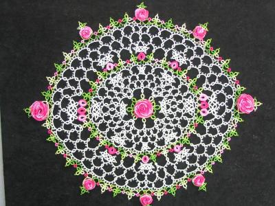 | This rose doily is an original design. It has received 1st place and Best of Division in the 2004 San Diego County Fair. It was also entered in the 2003 Los Angeles County Fair where it won 1st place and Judges Choice. The thread is Anchor size 80. | |