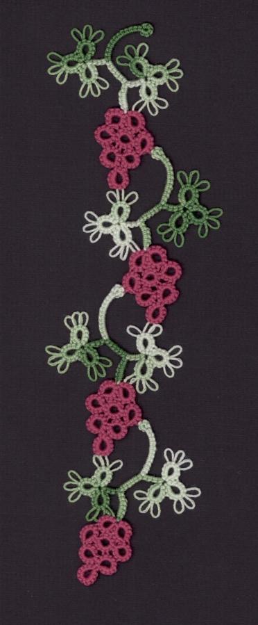 The theme for the 2004 Orange county fair was "Jammin' at the Fair" with grapes being the central image. It was given an honorable mention in the "Fair Theme, Clothing and Textiles, Other" class. The pattern is Mlle. Riego's grape pattern that was adapted by Martha Ess and is tatted in DMC size 80 thread |